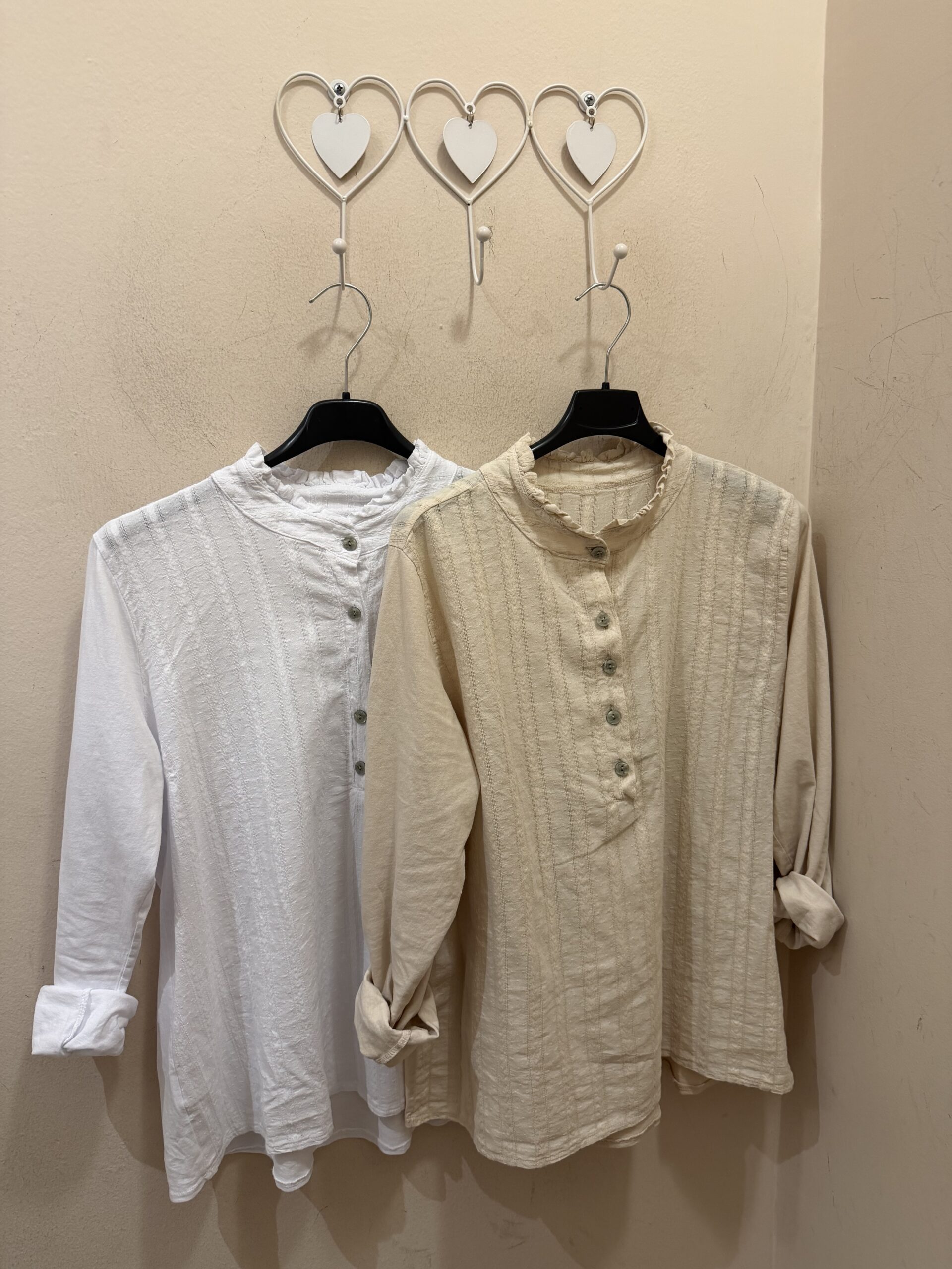 Camiseta tipo blusa con cuello mao fruncido, que realza el escote de forma sutil. El frente cuenta con una tapeta de botones pequeños, en un tono ligeramente contrastante. Las mangas y mitad de la espalda es de algodón ( de ahí camiseta blusa ) , lo que aporta un aire bohemio y natural, ideal para looks relajados pero con estilo.